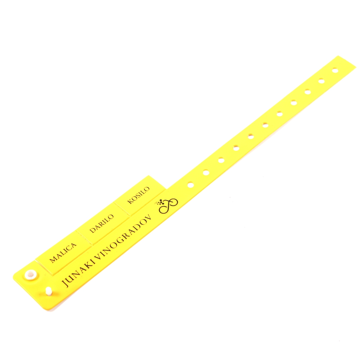 These bands come pre-printed with 1 to 10 tear-off tabs. They are one size fits all—simply wrap the wristband around your guest's wrist and secure it with the one-time snap. Once secured, it cannot be transferred to another guest.