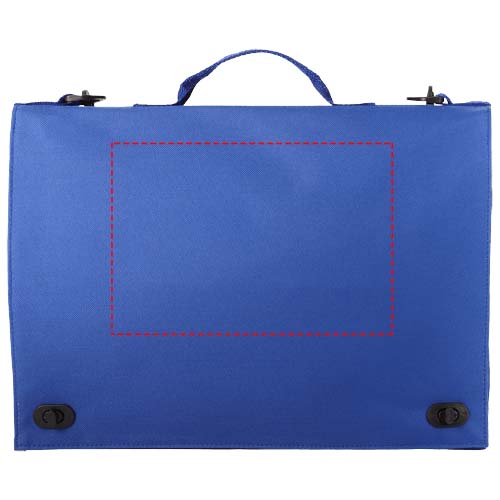 Conference bag with handle, adjustable shoulder strap, buckle closure and several document pockets.