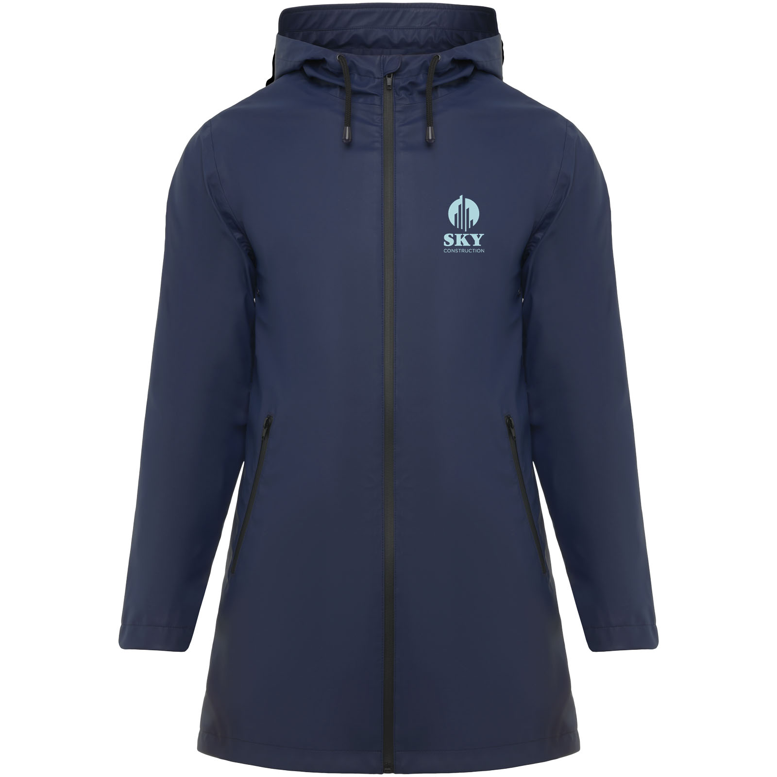 Waterproof raincoat for women. Hood with peak. Heat-sealed zips and seams. Contrasting details in black. Two side pockets with zip. Slit on back hem. Removable label. Waterproof. The model is 179 cm and is wearing size S.