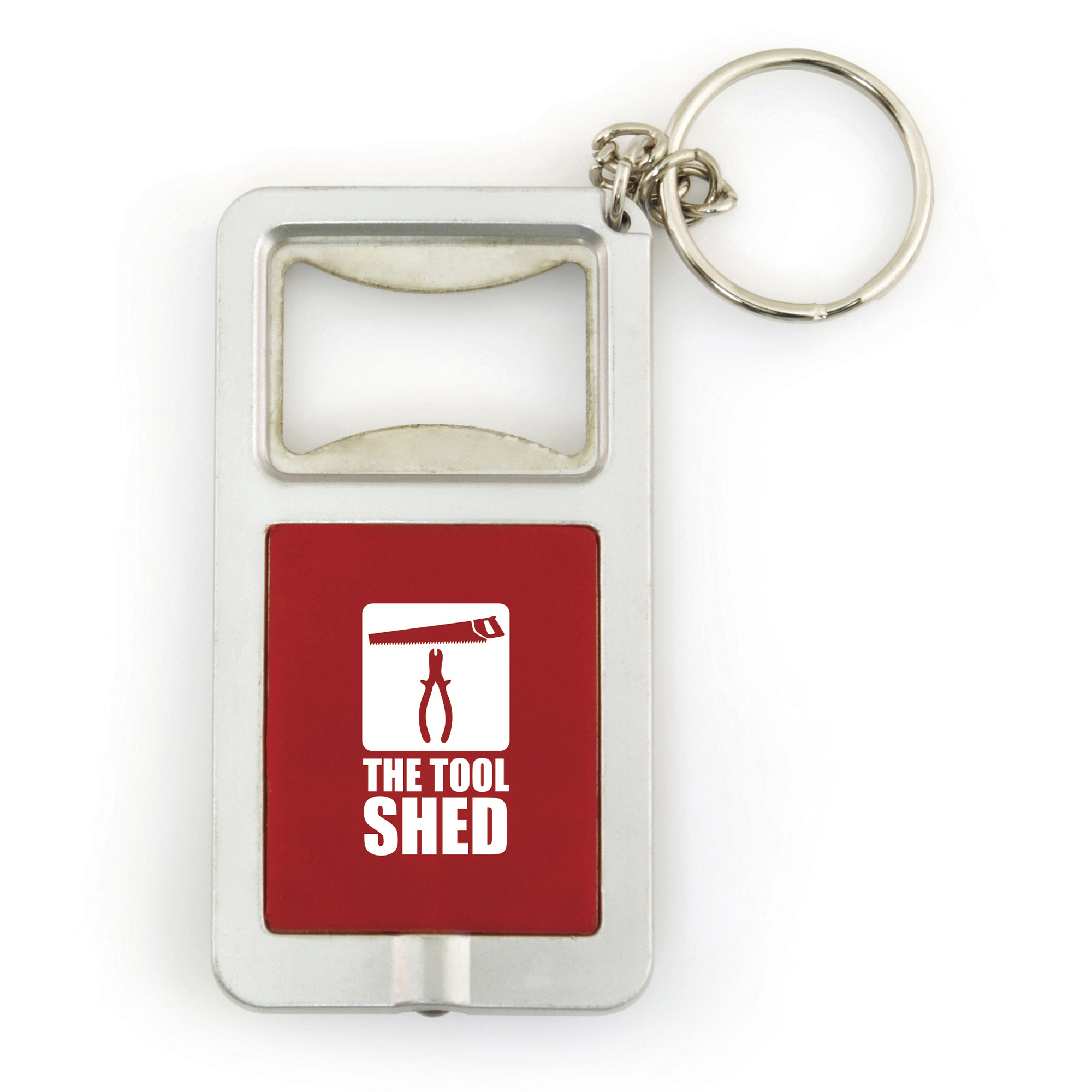 Plastic bottle opener with 1 LED light. Great promotional giveaway to launch a new bottled drink or to promote a bar or pub. Includes a keychain and split ring attachment. Batteries included.