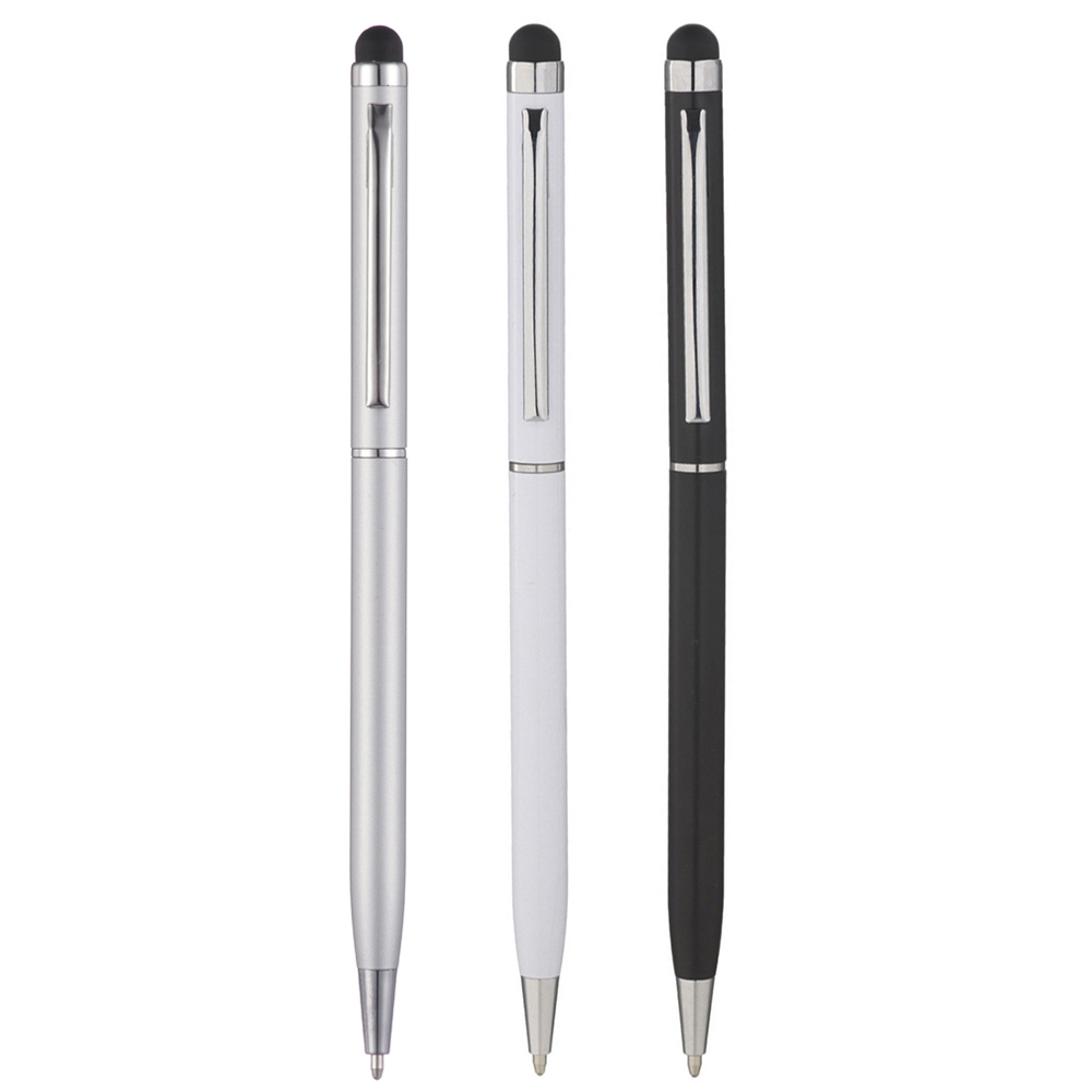An elegant, slim twist action ball pen with soft stylus at one end for use on soft touch devices.
