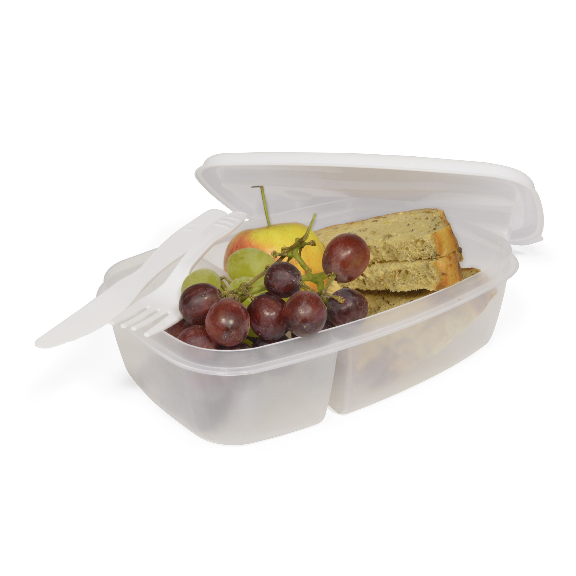 Lunch box and cutlery set. The main section of the lunch box is divided into two. The lid conceals a plastic knife and fork. Available in 2 colours