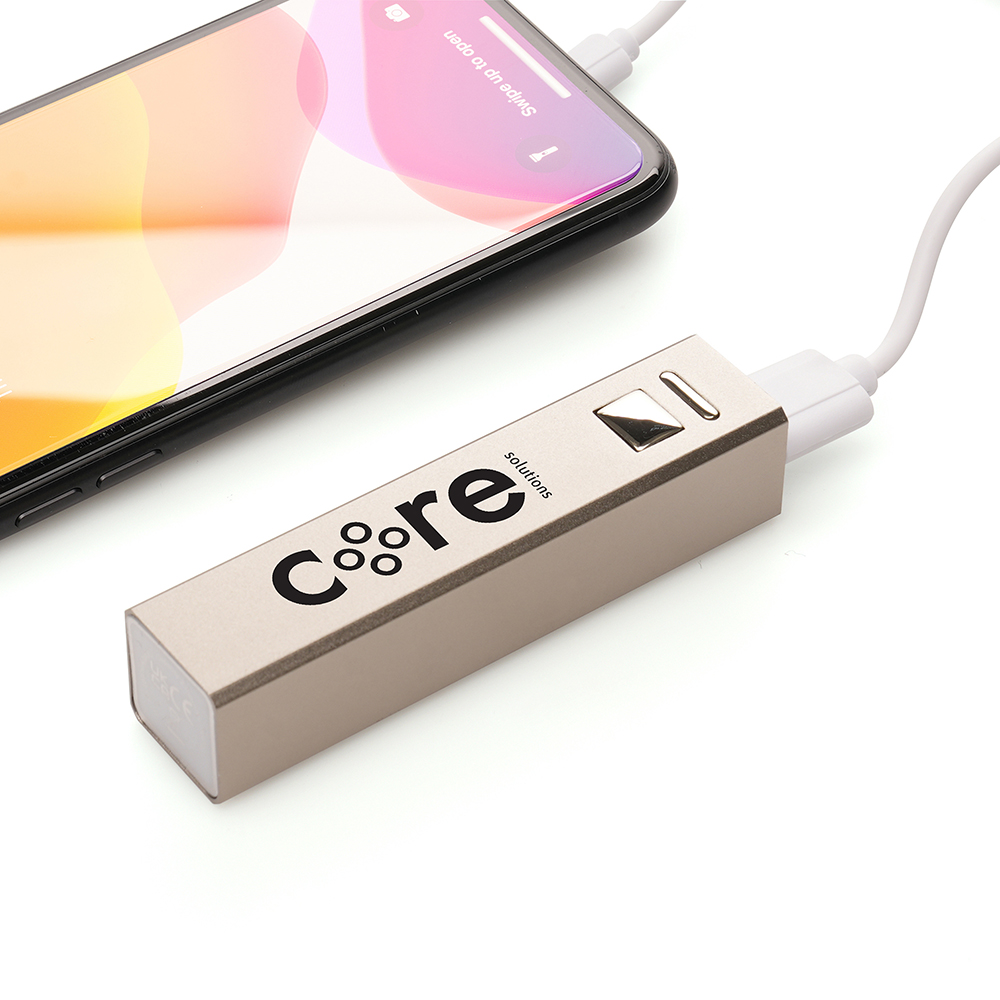 Portable cuboid shaped power bank with 2200mAh. Supplied with USB cable.