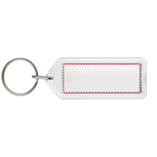 Clear rectangular F1 keychain with metal split keyring. This keychain is reopenable with a coin. The metal looped ring offers a flat profile which is ideal for mailings. Print insert dimensions: 5,0 cm x 2,0 cm.