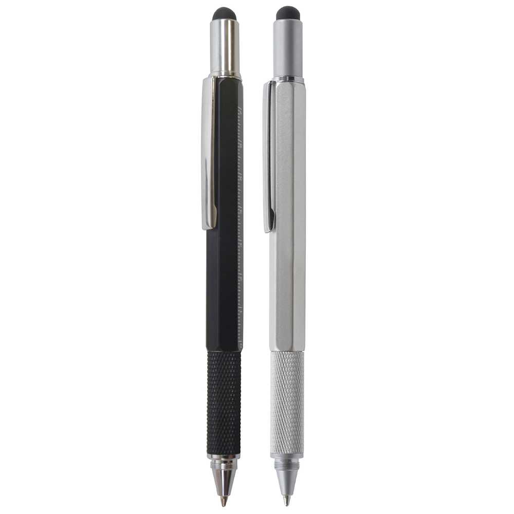 A hexagonal metal multi function pen with a soft stylus, slot screwdriver, Phillips screwdriver, cm rule and inch rule and a spirit level. Marking is by printing but can be offered engraved (at an additional cost). Pen is supplied in a polysleeve but can be supplied in a window box at an additional cost.
