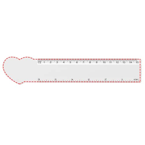 Heart-shaped solid recycled plastic ruler with markings in inches or centimetres.