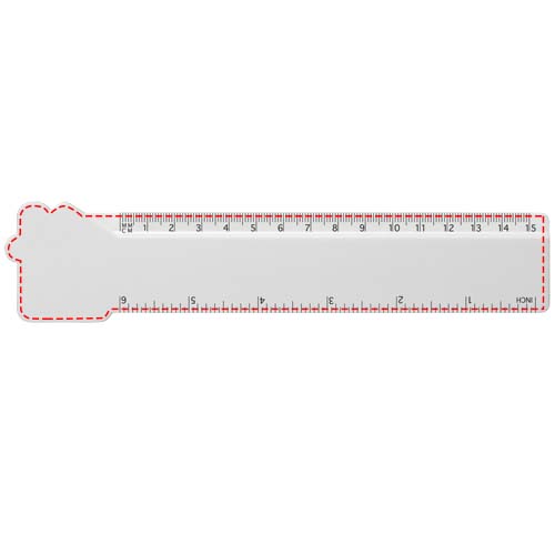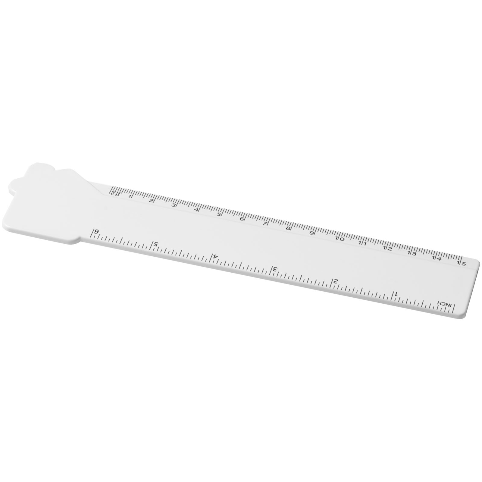 House-shaped solid recycled plastic ruler with markings in inches or centimetres.