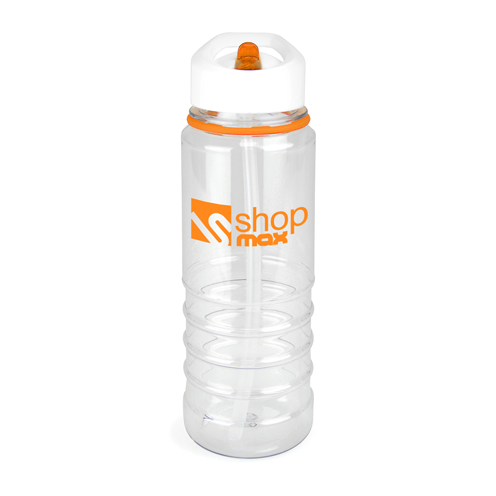 750ml single walled transparent PET plastic drinks bottle with white screw top lid, coloured band and coloured fold down sip mouthpiece (PP plastic lid, AS plastic sipper and PE plastic straw). The bottom half of the bottle is ridged for ease of grip. BPA & PVC free.