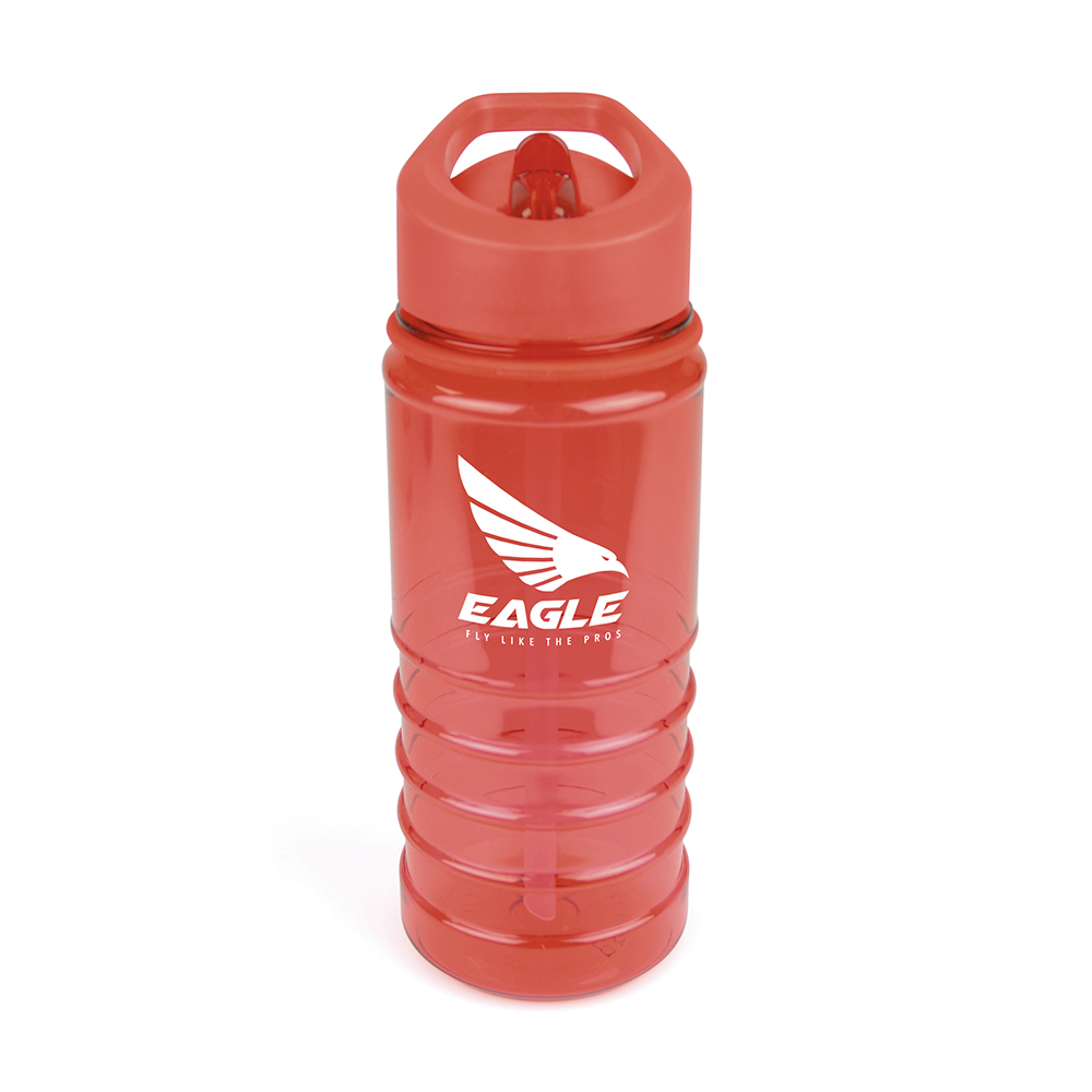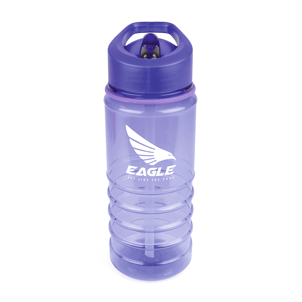 550ml single walled translucent coloured PET plastic drinks bottle with fold down drinking straw and ridged bottom half for grip. PP plastic lid, AS plastic sipper and PE plastic straw. BPA & PVC free. Available in 6 colours
