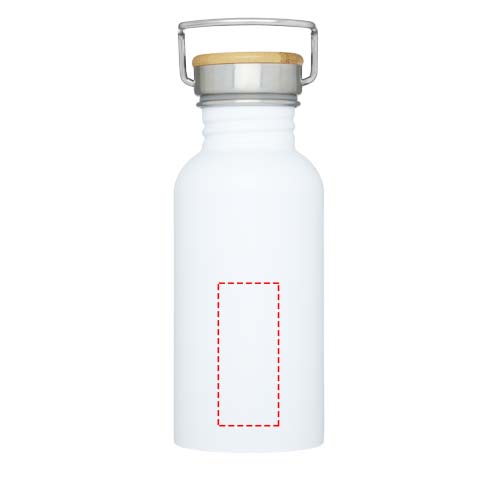 Single-walled stainless steel bottle with screw-on lid. The lid features a bamboo top, as well as a handle for easy carrying. Volume capacity is 550 ml. Presented in an Avenue gift box.