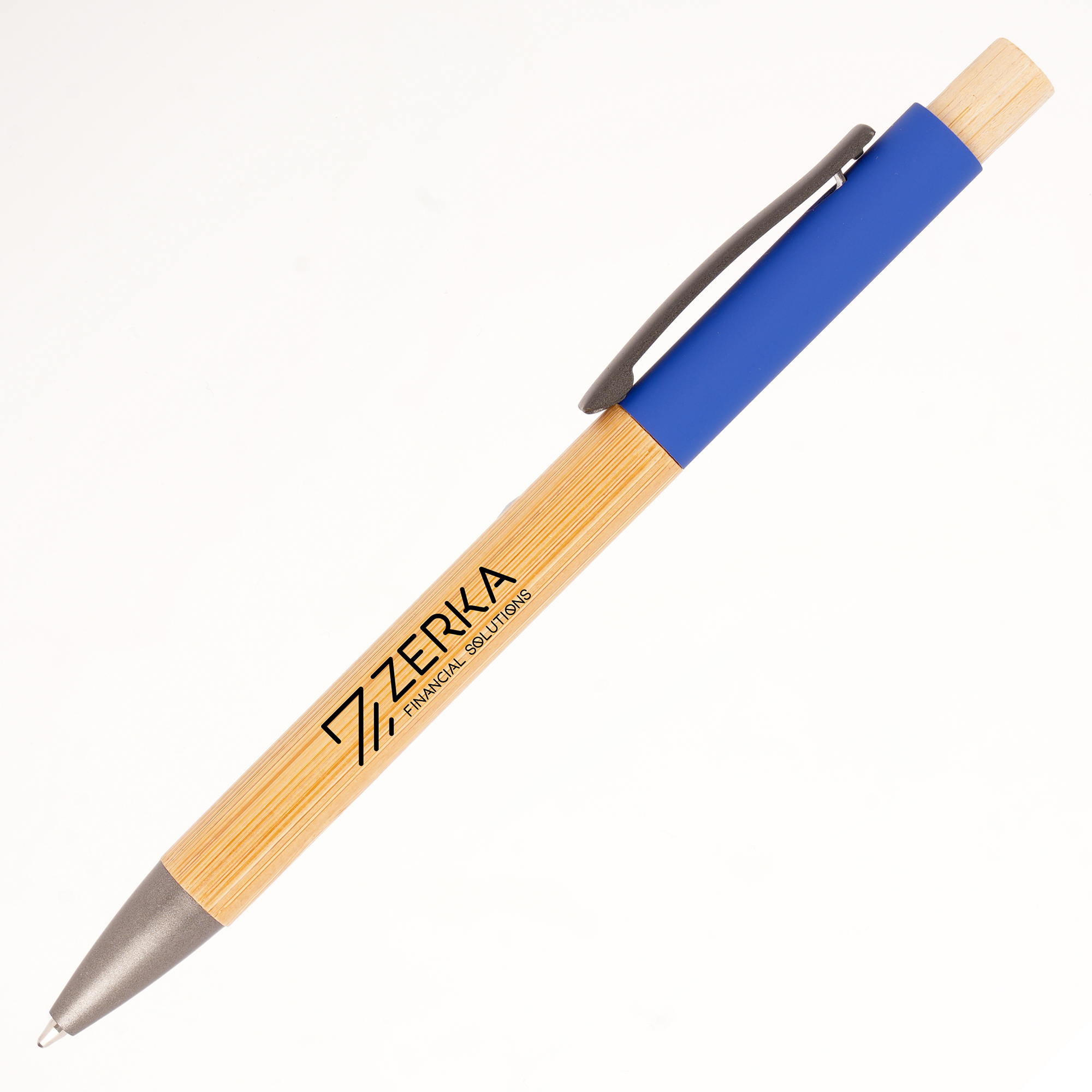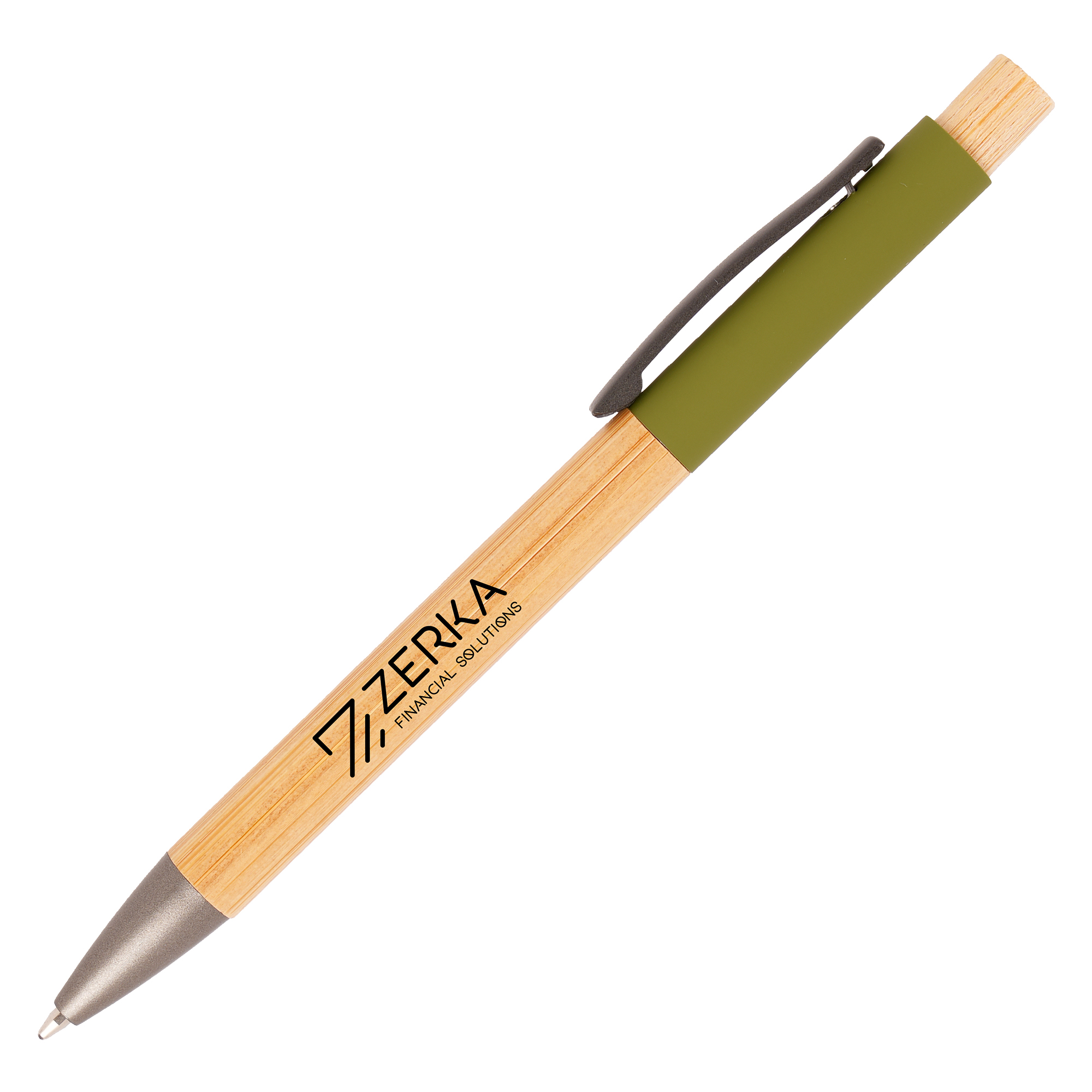 A stylish push action ball pen featuring a bamboo barrel made from a sustainable source with a coloured soft feel aluminium upper barrel.