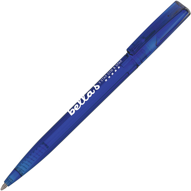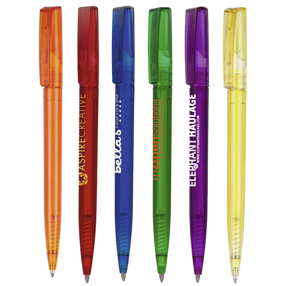 A low cost twist action pen with a great quality refill and large barrel print area. The pen has a vibrant translucent colour range, however the black and white have a solid finish (see TPC600201)
