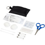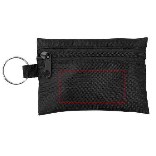 Convenient polyester pouch with keyring that holds 16 pieces of first aid supplies. The kit contains a pair of scissors (9 cm), 2 skin cleansing swabs, 1 elastic bandage (4 metre x 6 cm), 2 cotton balls (0.5g), 3 safety pins (3.6 cm), 5 plasters (45x19 mm), and 2 cotton pins (8 cm). Great for travelling, festival, events, and other outdoor activities, and has a large decoration area. A first aid kit is regarded as a medical device and is governed by 93/42/EEC, based on the intended use: “diagnosis, prevention, monitoring, treatment or alleviation of disease”. This medical device belong to CLASS I, Is.